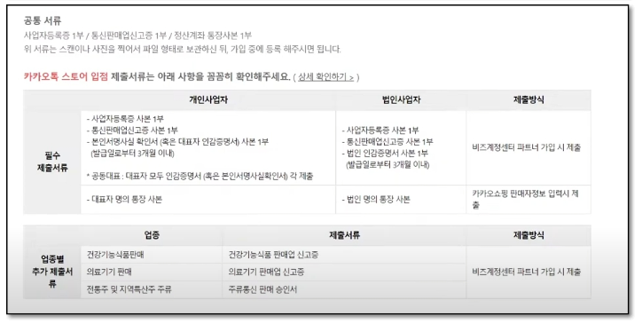 화면에 보이는 톡스토어 입점 서류를 확인하신 후, 준비가 완료되었다면 '카카오계정 가입하기' 버튼을 선택하십시오.