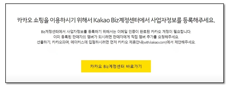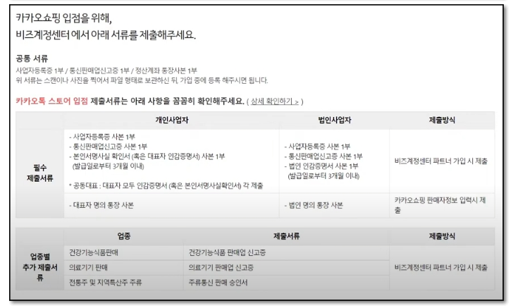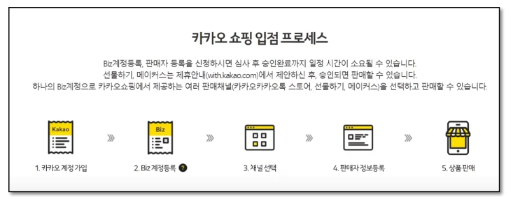 톡스토어 입점은 카카오 계정 가입 후 비즈니스 계정 등록을 하는 방식으로 이루어집니다.