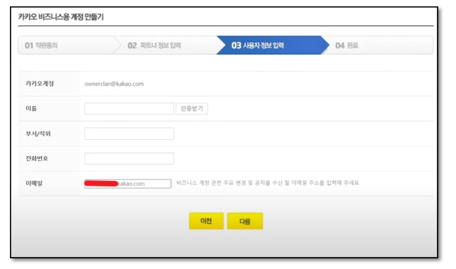 사용자 정보입력 단계에서는 이름 입력란 옆에 있는 '인증받기' 버튼을 선택하고 대표자 정보를 입력하십시오. 나머지 필요한 정보도 알맞게 기재한 후 '다음' 버튼을 선택하시면 됩니다.