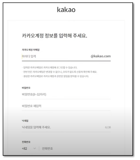 이제 카카오 계정을 만들기 위한 단계입니다. 화면에 보이는 입력란에 알맞은 내용을 기재하시고, 전화번호를 입력한 후 인증번호 확인 버튼을 선택하십시오. 입력한 전화번호로 문자가 전송되며, 문자에 적힌 인증번호를 화면에 보이는 입력란에 기재하면 전화번호 인증이 완료됩니다.