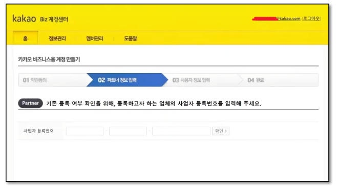 비즈 계정을 가입하기 위한 약관 동의 단계입니다. 약관 내용을 확인하고 체크 박스에 체크를 한 후 다음으로 넘어가시면 됩니다. 이제 파트너 정보입력 단계가 진행됩니다.