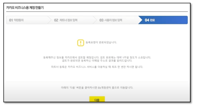 이제 비즈 계정 등록이 완료되었습니다. '다음' 버튼을 선택하면 비즈 계정 심사 요청 상태를 확인할 수 있습니다. 이로써 톡스토어 입점 과정을 모두 마친 것입니다.