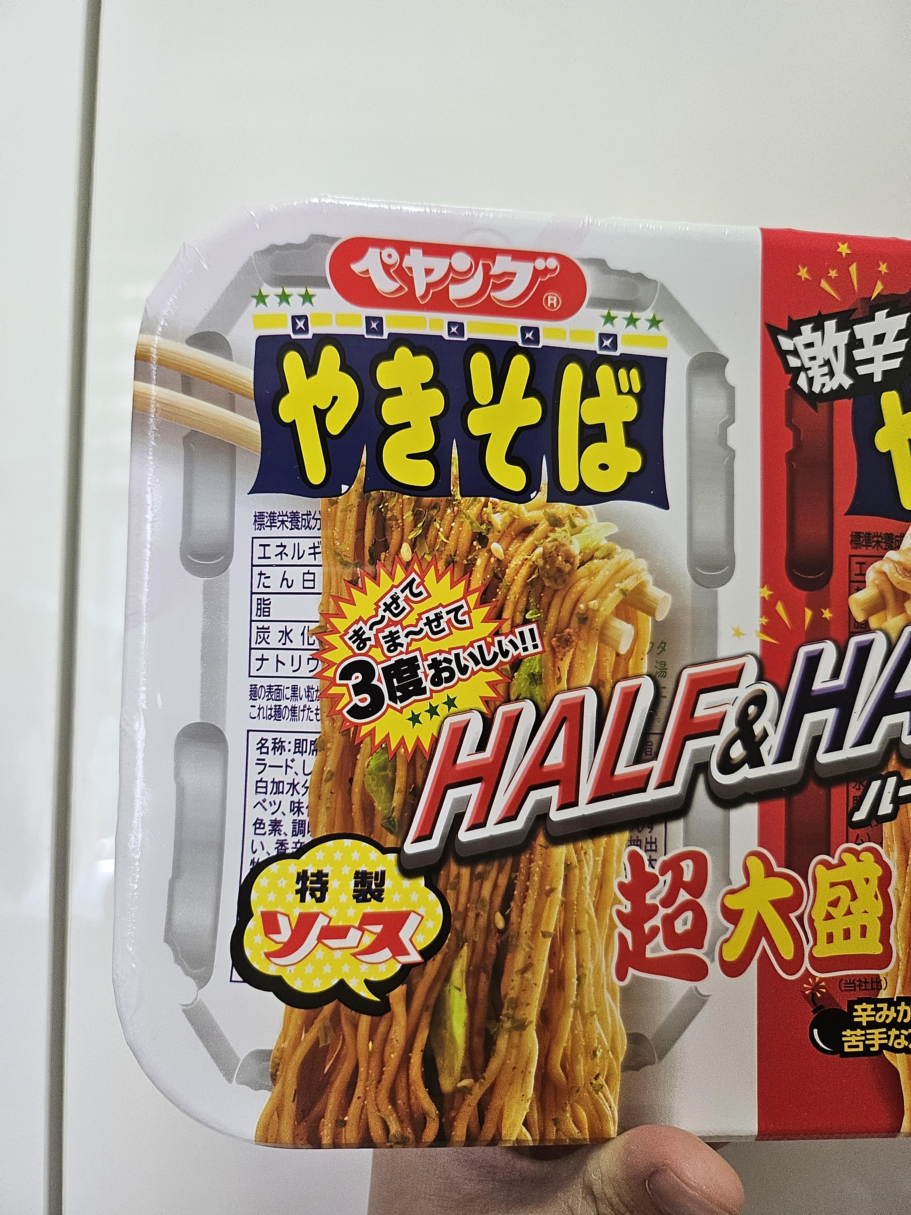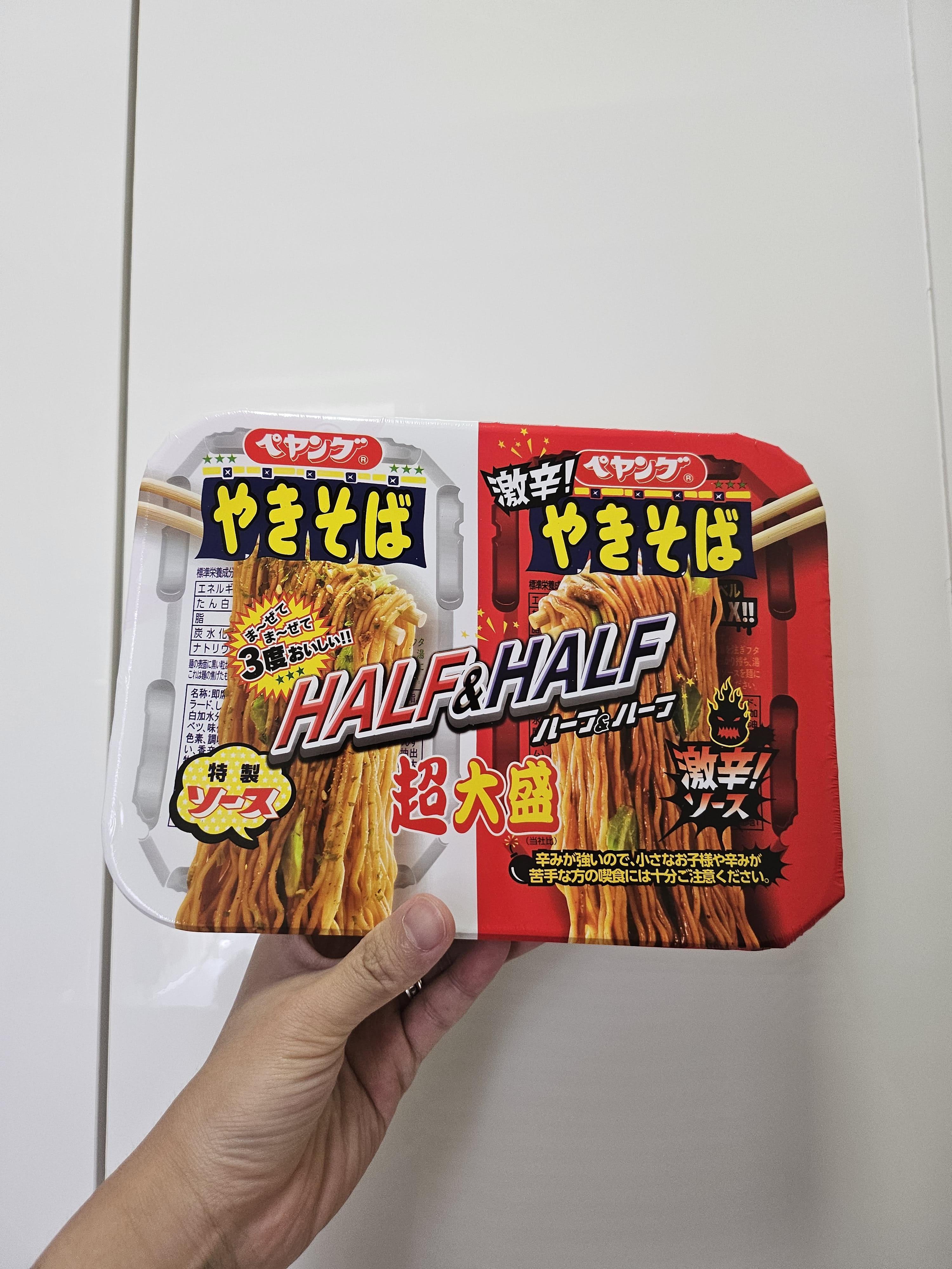 많은 분들이 일본 여행을 하실 텐데, 일본 여행하시면서 이색적인 일본 컵라면을 추천해드리고자 합니다. 페양구 야끼소바인데, 하프 앤 하프로 반반 맛으로 한국의 양념 반, 후라이드 반과 같이 2가지의 맛을 같이 먹을 수 있는 라면입니다. 폐양구 야끼소바 컵라면은 맛도 좋은데, 이렇게 반반 컵라면이 있어서 좋은 것 같습니다.