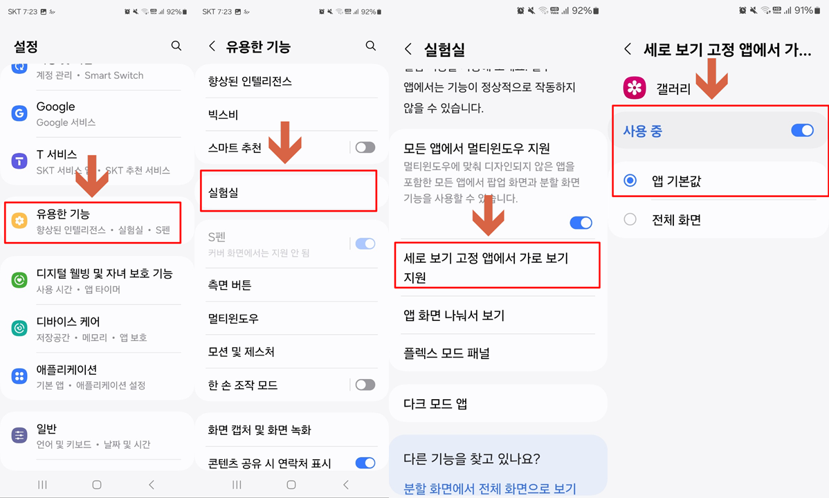 2. 실험실에서 세로 보기 고정 앱에서 가로 보기 앱 설정