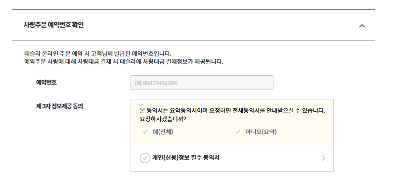 테슬라 예약시 나오는 예약 번호를 기입해야 합니다.