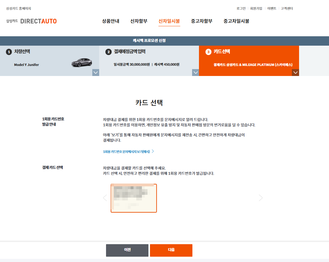 자동차 판매점에서 삼성카드로 일시불 결제를 진행하면 끝입니다.