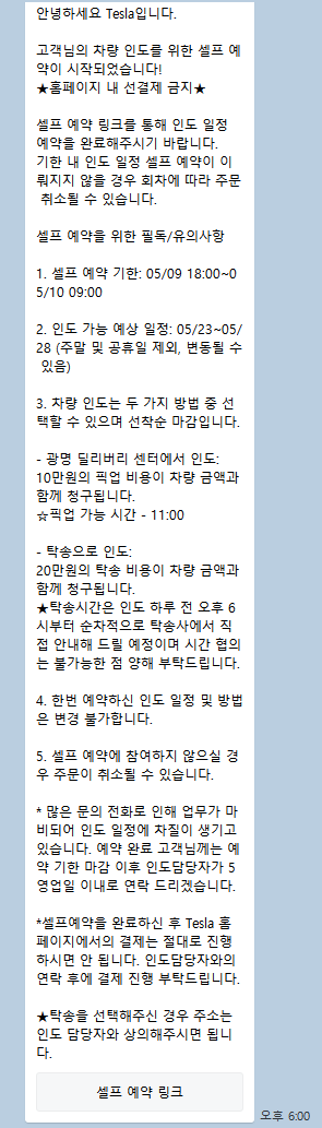 카톡을 보내준 당일 오후 6시부터 셆프 인도 예약이 활성화된다는 내용이었습니다.