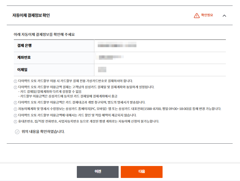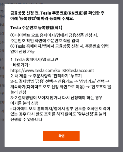 오늘은 테슬라 모델 y 주니퍼를 계약 진행하면서, 인도를 받기 전에 진행해야하는 결제에 대한 글을 작성하도록 하겠습니다. 테슬라의 결제는 삼성카드로만 가능하며, 테슬라를 구매하실분이라면 삼성카드를 미리 발급 하시는게 좋습니다. 선납금을 하면 캐시백을 받을 수도 있어서, 테슬라 구매하실분은 아래 블로그 글을 참고하시면 좋을 것 같습니다. 아래의 삼성카드 다이렉트 오토 링크를 통해 할부 결제를 진행할 수도 있고, 일시불 결제를 진행할 수 도 있습니다. 저는 할부 결제로 진행하였고, 진행한 내용은 아래 사진과 같이 남겼으니 참고하시어 따라 진행하시면 좋을 것 같습니다.