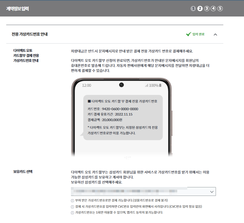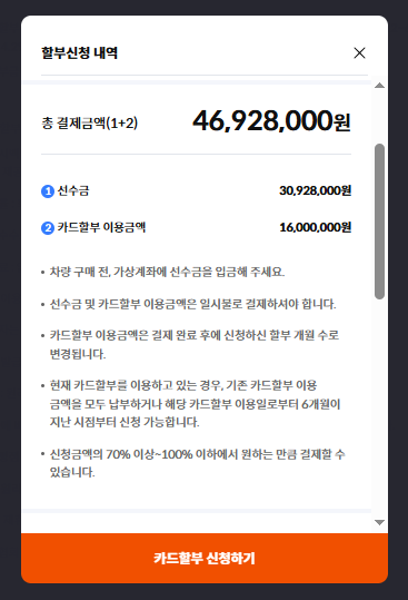 오늘은 테슬라 모델 y 주니퍼를 계약 진행하면서, 인도를 받기 전에 진행해야하는 결제에 대한 글을 작성하도록 하겠습니다. 테슬라의 결제는 삼성카드로만 가능하며, 테슬라를 구매하실분이라면 삼성카드를 미리 발급 하시는게 좋습니다. 선납금을 하면 캐시백을 받을 수도 있어서, 테슬라 구매하실분은 아래 블로그 글을 참고하시면 좋을 것 같습니다. 아래의 삼성카드 다이렉트 오토 링크를 통해 할부 결제를 진행할 수도 있고, 일시불 결제를 진행할 수 도 있습니다. 저는 할부 결제로 진행하였고, 진행한 내용은 아래 사진과 같이 남겼으니 참고하시어 따라 진행하시면 좋을 것 같습니다.