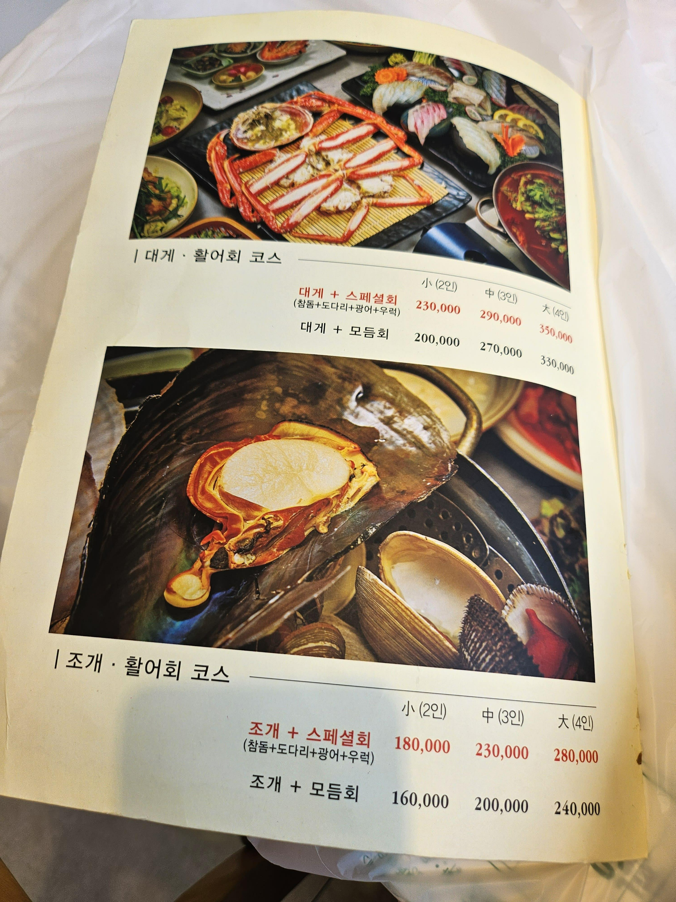 대게 + 조개 + 스페셜회(참돔 + 도다리 + 광어 + 우럭) 2인 290,000원, 3인 370,000원, 4인 440,000원