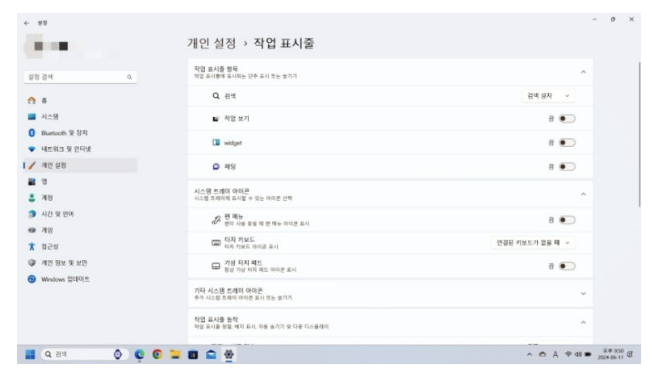 복잡한 작업표시줄을 단순하게 만들기 위해서 모두 껐습니다.